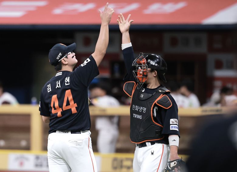 한화 투수 김서현과 포수 최재현이 5월9일 키움전에서 승리 세리머니를 하는 모습 [뉴시스] |