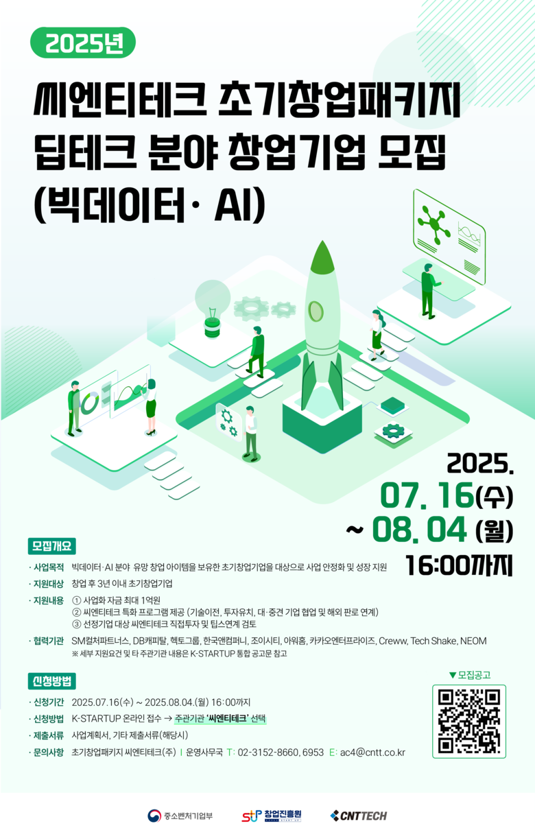 씨엔티테크(대표 전화성)는 중소벤처기업부와 창업진흥원이 주관하는 ‘2025년 초기창업패키지(딥테크 분야)’의 주관기관으로 참여하여, 유망 초기 창업기업을 모집한다고 7월 16일(수) 밝혔다.