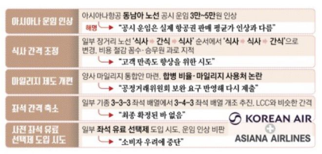 대한항공은 지난달 아시아나항공과의 마일리지 통합 방안을 내놓았으나 마일리지 사용처 축소를 포함해 소비자 보호 대책 미흡으로 반려됐다. 최근에는 중장거리 B777-300ER 항공기에 저비용 항공사(LCC) 수준인 ‘3-4-3 좌석 배열’을 추진해 승객들이 닭장같이 좁은 좌석에서 장거리 비행을 견뎌야 한다는 비판이 나왔다.