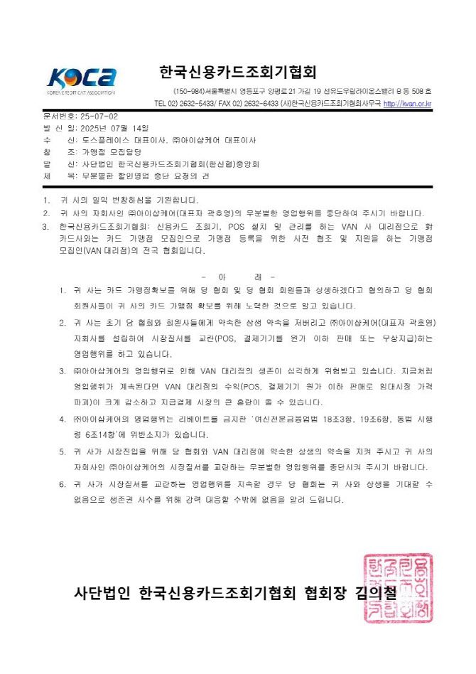 한신협은 최근 토스플레이스와 아이샵케어 측에 “지급결제 시장 질서를 교란하는 공격적 영업행위를 즉시 중단해 달라”는 내용의 공문을 발송했다. 공문에는 아이샵케어가 시중에서 20~30만 원 상당의 카드단말기를 일부 가맹점에 무료 또는 저가에 제공하고 있다는 의혹이 담겼다.