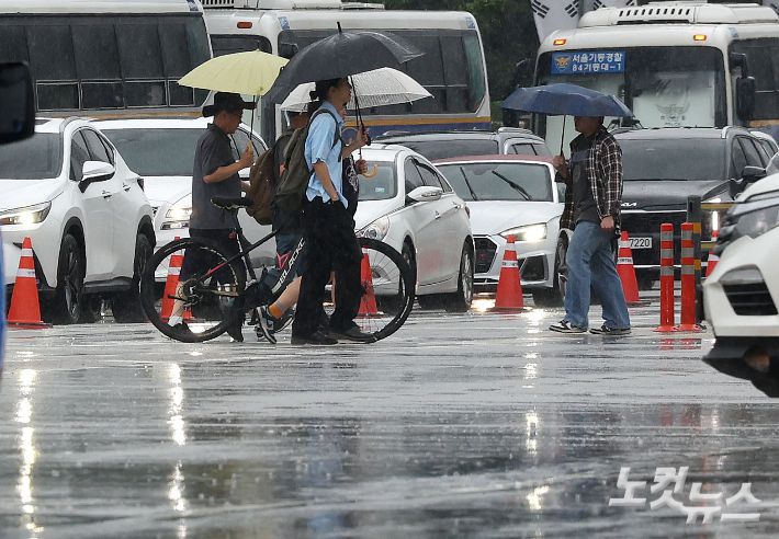 전국 대부분 지역에 비가 내린 16일 오후 서울 여의도 일대에서 우산을 쓴 시민들이 발걸음을 옮기고 있다. 류영주 기자 |