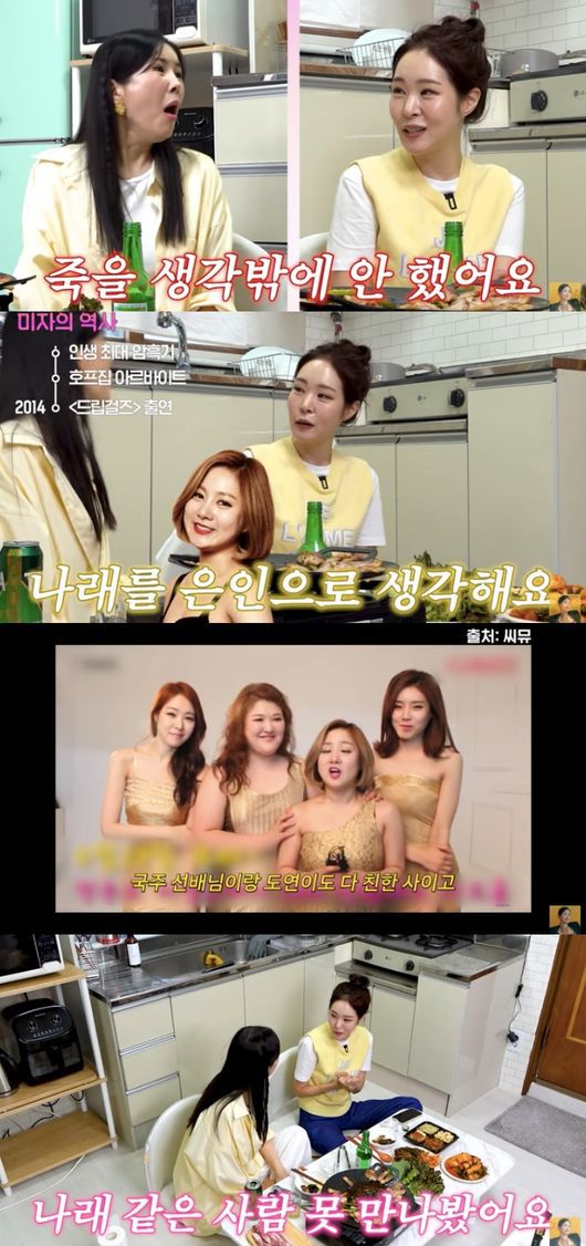 3년 동안의 우울증을 견디게 해준 건 다름 아닌 박나래 덕분이라고. 미자는 “초창기 1~2년 아무것도 못할 상태였고 나중에 지나서 살아야겠다는 생각에 호프집 아르바이트 했다. 그리고 회사에서 ‘드립 걸즈’ 추천해주더라. 제가 방송 하면서 상처가 너무 많고 더 이상 방송하는 사람 만나고 싶지 않다고 거절했는데 계약 기간이 남아서 하게 됐다”라고 말했다.