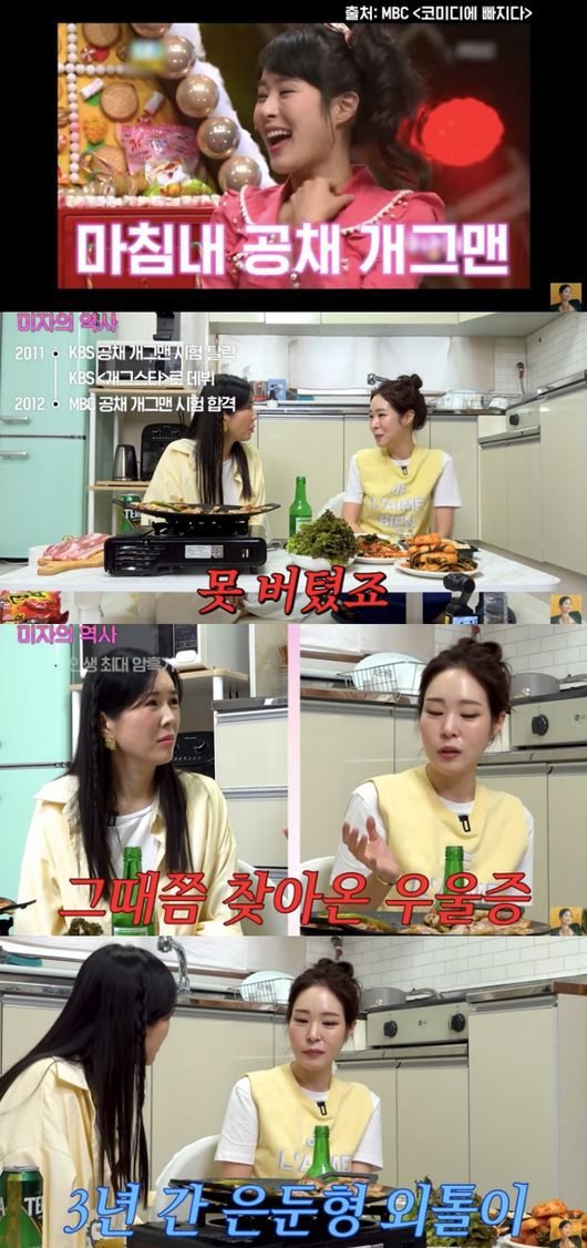 이날 미자는 아나운서 준비 6년, KBS 공채 탈락 후 우여곡절 끝에 MBC 공채 개그맨이 됐지만 오래 버티지 못했다고 밝혔다. 그는 “거기 제가 있을 곳은 아니더라. 그리고 군기 같은 게 너무 세서 못 버텼다. 거의 절반이 그만뒀고 제일 맨 마지막에 관뒀다”라고 말했다.