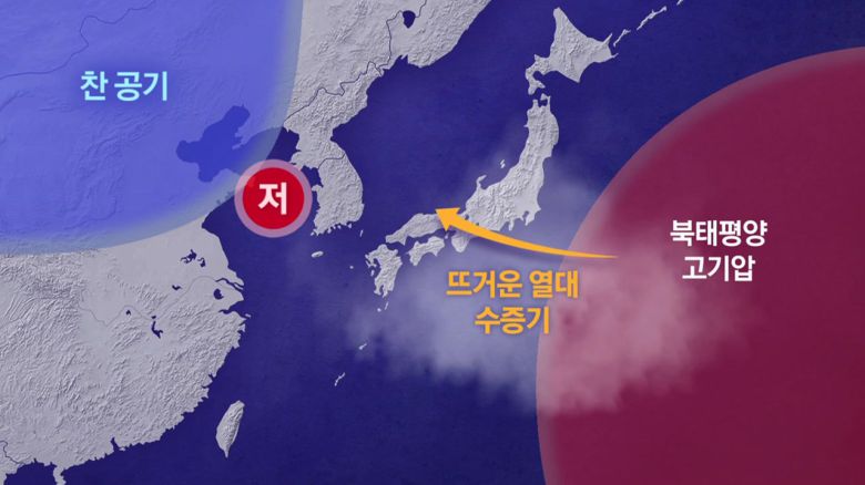 네, 우리나라 주변 기압 배치 모식도보면서 이번 폭우의 원인을 짚어보겠습니다. 한반도 남동쪽에는 여름철 우리나라 날씨에크게 영향을 주는 고온 다습한 북태평양 고기압이 점차 세력을 넓혀가고 있습니다. 이 고기압의 가장자리를 따라서남쪽의 뜨거운 열대 수증기들이 우리나라로 몰려 올라오고 있습니다. 동시에 북쪽에서는 차고 건조한 공기가내려오고 있는데요. 이 찬 공기가 내려오는 과정에서 대기가 불안정해지면서 저기압이 발달하게 됩니다. 그리고 점차 북쪽의 찬 공기와 남쪽의 뜨거운 공기가,그러니까 성질이 다른 두 공기가 우리나라에서 서로 충돌하게 되는데요. 이 공기들이 강하게 충돌하고저기압이 지나는 위치가 이번에 중부지방과 전북이기 때문입니다.
