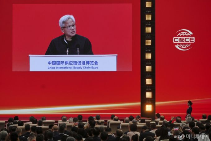 [베이징=AP/뉴시스] 젠슨 황 엔비디아 최고경영자(CEO)가 16일(현지 시간) 중국 베이징에서 열린 제3회 중국 국제 공급망 촉진 박람회(CISCE) 개막식에서 기조연설하고 있다. 2025.07.16. /사진=민경찬 |