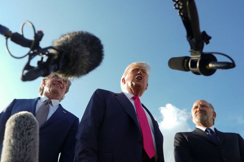 “확기적인 협정” 체결 후 도널드 트럼프 미국 대통령이 15일(현지시간) 메릴랜드주 앤드루스 공군기지에서 기자들 질문에 답하고 있다. 로이터연합뉴스 |