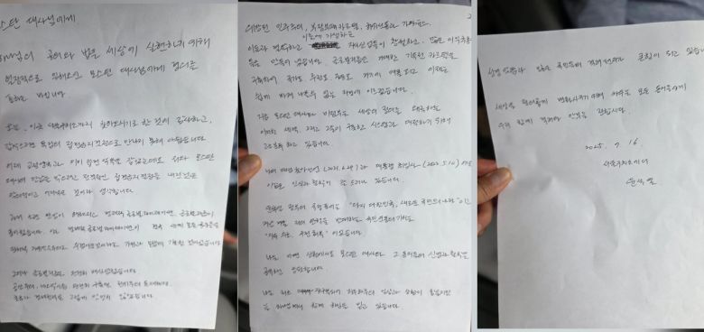 이를 본 윤 전 대통령은 자필로 답장을 썼지만 구치소 규정상 수용자가 작성한 서신은 당일 반출이 금지된 까닭에 그 자리에서 김 변호사가 윤 전 대통령이 쓴 편지의 내용을 그대로 옮겨 적었다.