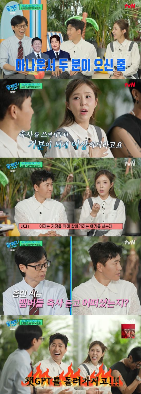 유재석은 "종민 씨는 어땠냐, 축사를 듣고"라며 질문했고, 김종민은 "괜히 울면 좀 그렇지 않냐. 많이 참는 게 느껴져서 고맙더라. 빽가 씨 축가가 와닿지 않더라. 왜인지 했더니 챗GTP를 돌려서"라며 폭로했다.