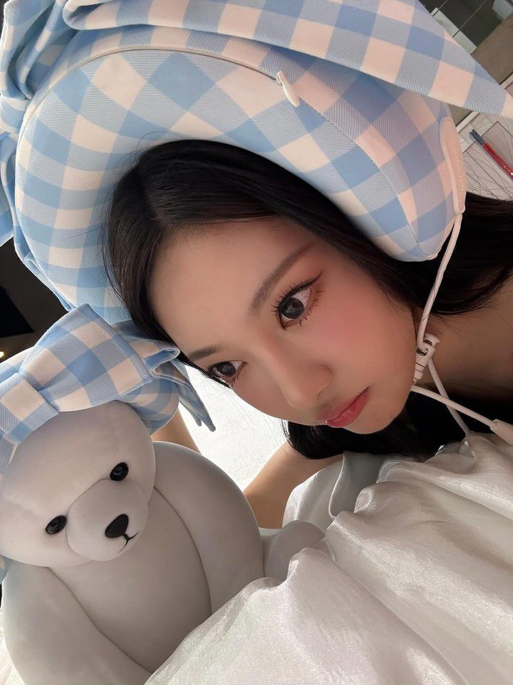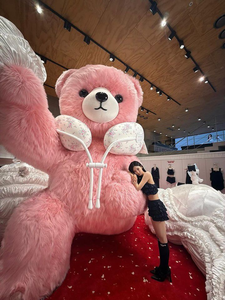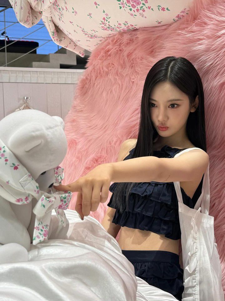 마지막 컷에서 닝닝은 거대한 핑크 곰인형을 꼭 껴안으며 따뜻한 포즈를 연출한다. 블랙 니삭스와 블랙 하이힐의 조합은 다리를 더욱 길어보이게 만들었고, 길게 뻗은 각선미와 작은 얼굴이 어우러지며 만화 속 주인공 같은 비현실적인 비율을 완성했다.