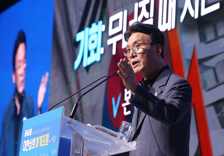 김민석 국무총리가 16일 경북 경주시 라한셀렉트 호텔에서 열린 제48회 대한상공회의소 하계포럼에 참석해 기조연설을 하고 있다. /연합뉴스