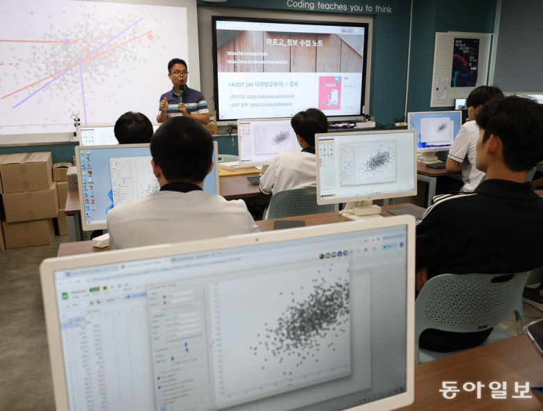 16일 오후 서울 강서구 마포고등학교에서 학생들이 인공지능(AI) 교육을 받고 있다. 현행 교과서는 2022년 제작돼 챗GPT 같은 생성형 AI의 내용이 담겨 있지 않기 때문에 이날 수업은 교사가 자체 개발한 교과서로 진행됐다. 변영욱 기자 cut@donga.com