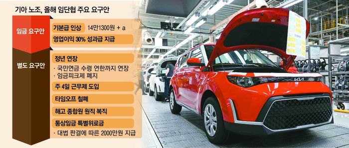 기아 노조가 올해 임금·단체협상 과정에서 회사 측에 총 3조8000억원의 성과급과 주 4일제 도입을 전격 요구하고 나섰다. 기아 노조는 최대 만 64세로 정년을 연장해 달라고 요구했고 통상임금 범위를 확대한 대법원의 판결에 따라 위로금 2000만원을 달라고 주장했다. HD현대중공업과 현대자동차에 이어 기아 등 임단협을 앞둔 대기업 노조들이 정년 연장과 주 4일~4.5일제 등의 과도한 요구를 공통적으로 쏟아내기 시작했다.