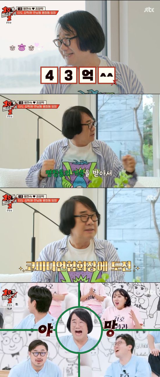 그러나 '43억'이라는 가격을 들은 팽현숙이 경악하는 반면 최양락은 해맑게 웃었고, 김학래는 "최양락이 돈도 없지만 현실 감각도 없다"라고 디스했다.