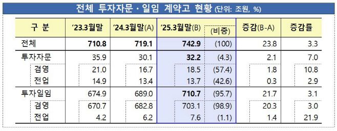 아시아투데이 유수정 기자 = 지난 3월 말 기준 국내 투자자문·일임사 793곳의 계약고는 742조9000억원으로 전년 동기 대비 23조8000억원(3.3%) 늘어난 것으로 나타났다. 전체 증가분의 92.9%(22조1000억원)가 자산운용사, 증권사, 은행 등 겸영 투자자문·일임사에서 발생했다. 전업 투자자문·일임사의 계약고 증가분은 전체의 7.1%(1조7000억원) 수준으로 나타났다. 다만 전년 동기 대비 증가율은 전문사(8.9%)가 겸영사(3.2%)를 두 배 이상 앞질렀다.