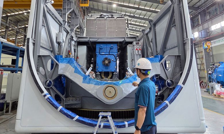 이 하얀색 상자의 명칭은 나셀. 풍력발전기는 크게 네 부위로 나뉜다. 지면 또는 해저에 심는 ‘하부구조물’, 바람에 회전하는 부분인 ‘로터’, 발전기 기둥을 칭하는 ‘타워’, 전력 생산에 필요한 핵심 부품을 담아둔 거대 상자인 ‘나셀’로 구분한다. 나셀은 풍력발전기를 떠올릴 때 날개(블레이드) 뒤로 뒤통수처럼 나와 있는 부분으로, 바람으로 발생한 회전에너지를 전기로 바꾸는 발전기, 회전 속도를 높여주는 증속기(기어박스), 전압을 일정하게 유지해주는 전력변환장치(인버터) 등 전력 생산에 꼭 필요한 부품들이 조립돼 있는 패키징이라 생각하면 된다. 통상 하부구조물과 타워를 제외하고 로터와 나셀을 총칭하는 ‘풍력터빈’을 제작하는 기업은 국내에 두산에너빌리티와 유니슨 두 곳뿐이다.