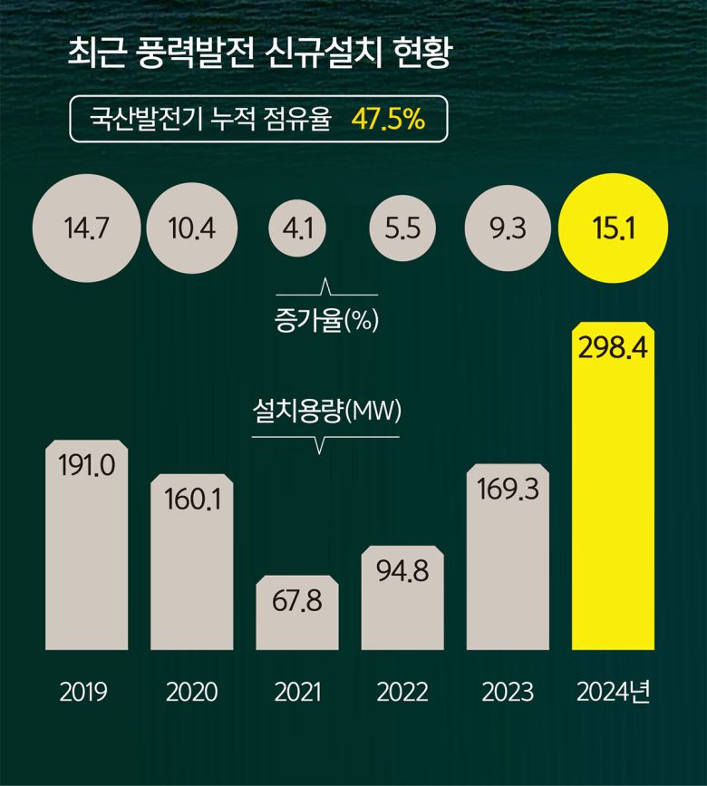 2000년대 중반부터 시작해 10여년간 육상풍력이 활발히 보급된 뒤로 해상풍력은 수년째 거의 나아가지 못하는 실정이다. 풍력산업협회가 집계한 최근 10년간 연도별 설비용량 증가율은 2015년 36.3%로 최고치를 찍고 2021년 한 자릿수로 고꾸라졌다. 2020∼2024년 5년간 우리나라 풍력설비 연평균 증가율은 8.8%에 그치는 반면 중국은 내수시장을 발판 삼아 2013년부터 10년간 연평균 증가율이 19.1%에 달한다. 국내 풍력시장이 위축될수록 기업의 생산 물량이 줄어들며 경제성은 악화했고 연구개발(R&D)에 투자할 유인이 떨어지며 다른 나라와 기술 격차는 벌어졌다. 유니슨과 두산에너빌리티가 10㎿ 터빈 상용화를 앞둔 사이에 유럽과 중국 터빈 업체들은 20㎿ 이상 제품을 개발했다. 기술이 쇠퇴하고 가격 경쟁력을 잃은 제품은 외면받을 수밖에 없다.