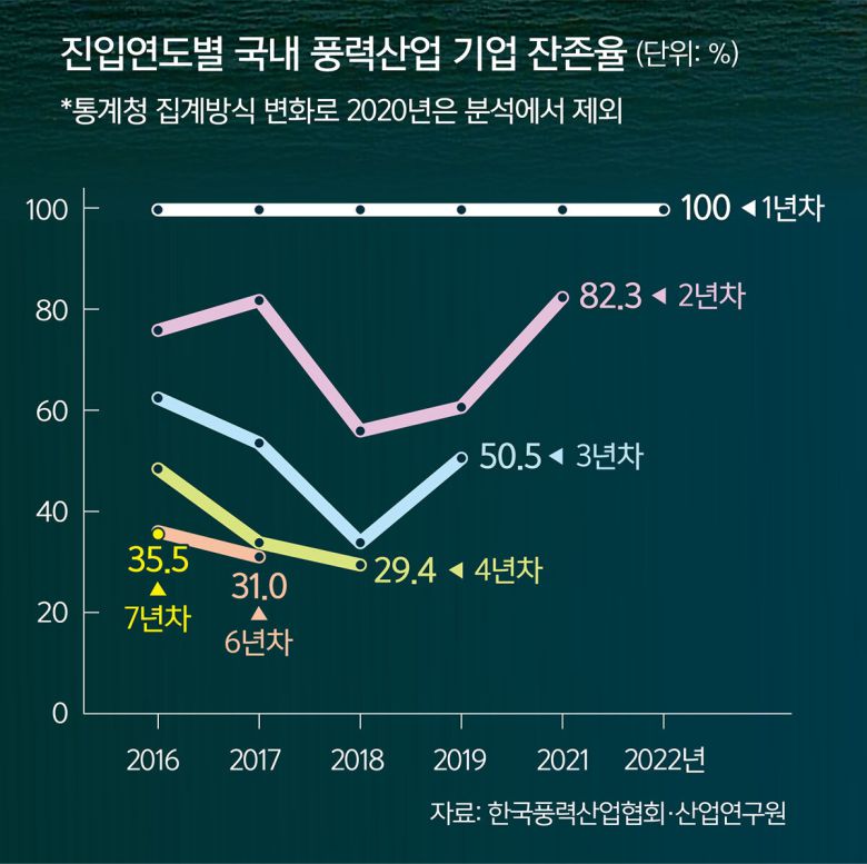 2016년을 끝으로 조선업계 대기업 중 마지막까지 풍력사업을 버텼던 현대중공업도 철수했다. 한국풍력산업협회와 산업연구원이 지난해 12월 발간한 ‘해상풍력 공급망 현황 점검’ 보고서에 따르면 2016년 풍력산업에 새로 진입한 국내 업체는 186개였다. 이 중 2019년까지 풍력산업 관련 업체로 남아있는 사업장은 90개(48.4%)에 불과했고 2022년에는 66개(35.5%)로 줄었다. 2020∼2021년 신규 사업체가 급증한 배경으로는 부품장비 등 제조업체가 아닌 발전사업자가 증가한 것으로 나타났다. 이 분석을 진행한 이슬기 산업연구원 연구위원은 “통계청 사업체 전수조사 결과를 토대로 업체가 폐업하지 않고 풍력사업만 철수한 경우를 감안해 생존율이 아닌 잔존율이란 용어를 사용했다”며 “진입 2년 후부터는 잔존율이 뚝뚝 떨어져 안정적인 수요 확보와 중소기업 지원이 필요하다”고 말했다.