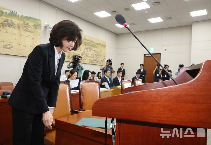 [서울=뉴시스] 고승민 기자 = 이진숙 사회부총리 겸 교육부 장관 후보자가 지난 16일 서울 여의도 국회 교육위원회에서 열린 인사청문회에서 모두발언 후 인사를 하는 모습. 2025.07.16. kkssmm99@newsis.com