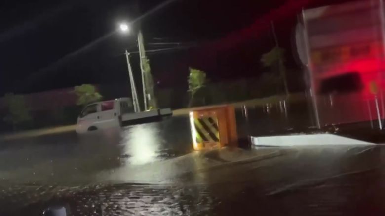 트럭을 포함한 차량 2대가 오도 가도 못하고 물에 빠진 채 서 있습니다.