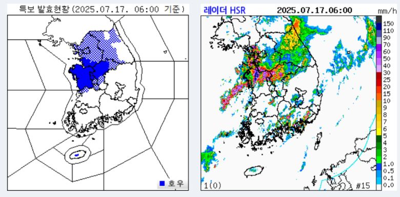 17일 오전 6시 중부지방과 전북 북서부에 호우특보가 발효됐다. 기상청에 따르면 중부지방을 중심으로 시간당 20~80mm의 매우 강한 비가 내리고 있다. 비는 돌풍과 함께 천둥·번개를 동반하고 있다.