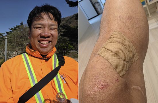 해당 사진에는 무릎을 다쳐 밴드를 붙인 그의 모습이 담겨 있어 안타까움을 자아냈다.