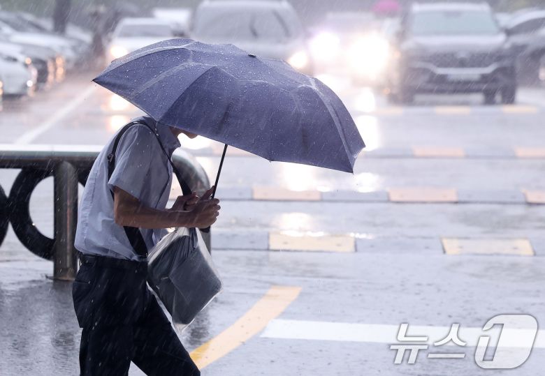 서울 서초구 서울중앙지법 인근에서 우산 쓴 시민들이 출근을 하고 있다. 2025.7.17/뉴스1 ⓒ News1 박지혜 기자 |