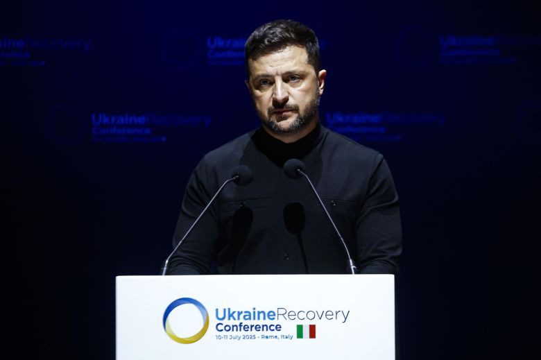 볼로디미르 젤렌스키 우크라이나 대통령이 지난 10일(현지시간) 이탈리아 로마에서 열린 우크라이나 복구 회의 2025에서 연설하고 있다. [EPA] |