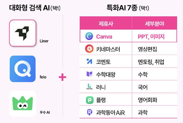 추가 7종은 그래픽 디자인 서비스인 ‘캔바’, 영상 편집 ‘키네마스터’, 영어회화 서비스 ‘플랭’, 면접 코칭 서비스 ‘코멘토’, 국어학습서비스 ‘러니’, 과학학습서비스 ‘과학동아AiR’, 수학학습서비스 ‘수학대왕’이다. 이중 가장 알려진 서비스는 전세계 1억명 이상의 사용자가 있는 캔바다. 캔바의 이용금액은 월 9900원이다.