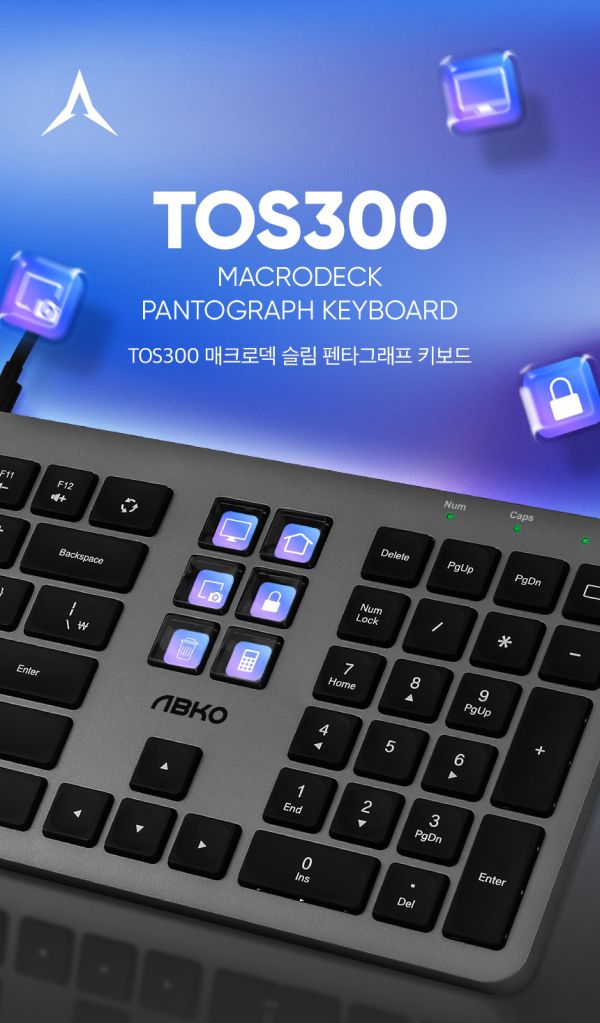 앱코 관계자는 "TOS300은 직관적인 LCD 매크로덱을 탑재해 작업 효율을 높인 키보드"라며, "PPT, 디자인 업무 등 단축키 활용이 잦은 학생, 직장인 사용자에게 만족스러운 제품이 될 것"이라고 전했다.