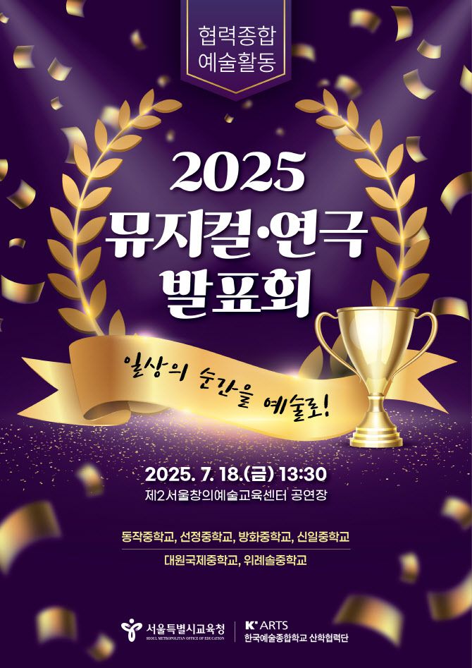 정근식 서울시교육감은 “최근 한국 창작 뮤지컬 ‘어쩌면 해피엔딩’이 토니상을 수상한 것은 우리 문화 콘텐츠가 세계적으로 인정받고 있음을 보여주는 사례”라며 “학교 예술교육이 청소년들의 창의적 표현력과 협업 능력을 키우는 토대가 되길 바란다”고 말했다.