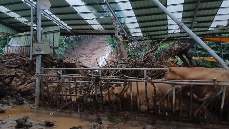 사진을 보시면, 폭우에 산에서 토사와 나무들이 밀려 들어오면서 축사 뒤가 뻥 뚫려있습니다.