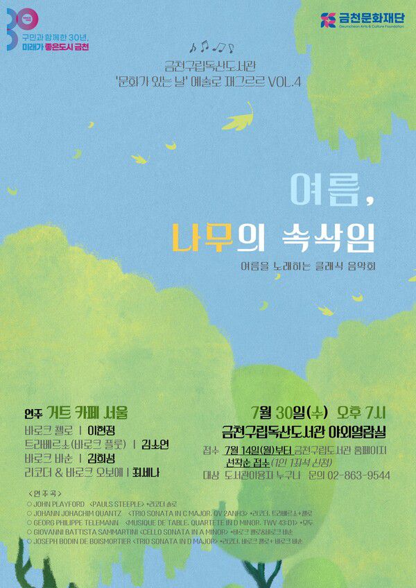 [백현석 기자] (문화뉴스 백현석 기자) 7월 '문화가 있는 날'을 맞아 금천문화재단(대표이사 서영철) 금천구립독산도서관이 7월 30일 오후 7시, 거트 카페 서울과 함께하는 고전 음악회 '여름, 나무의 속삭임'을 개최한다.