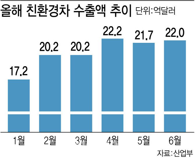 전기차 수출 반등에 힘입어 하이브리드차를 포함한 전체 친환경차 수출액도 22억달러로 전년대비 18.7% 증가했다. 또 친환경차 수출 호조로 전체 자동차 수출액 역시 전년대비 2.3% 늘어난 63억 4000만달러를 기록했다. 6월 기준 역대 최대다. 이 기간 전체 수출물량(24만 4427대)는 전년대비 3.1% 줄었으나 상대적으로 고가인 전기차 판매 증가가 액수 기준 최대 실적으로 이어진 것이다.