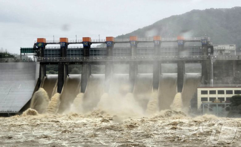 (괴산=뉴스1) 이성기 기자 = 한국수력원자력 괴산발전소가 17일 괴산댐 수문 7개를 모두 열고 초당 1000톤의 물을 하류로 흘려 보내고 있다.2025.07.17. 2025.7.17/뉴스1