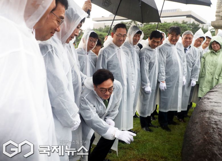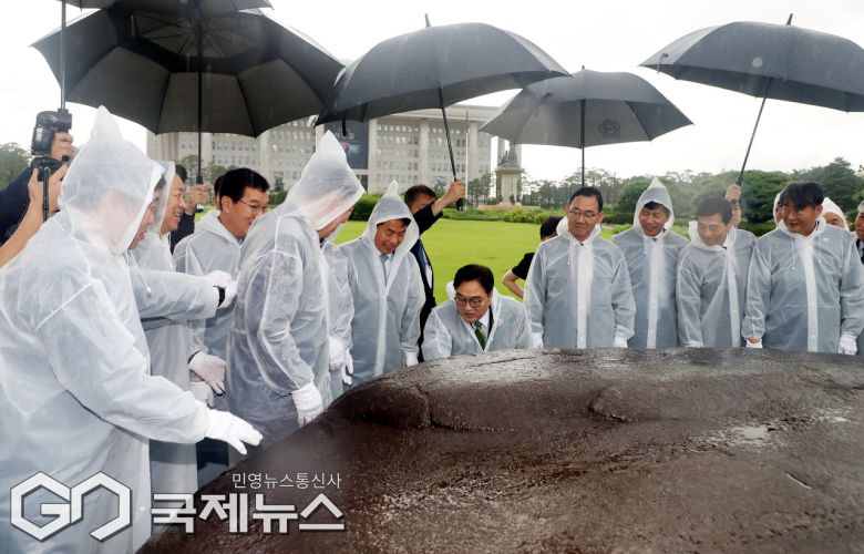 (서울=국제뉴스) 17일 오전 서울 여의도 국회 잔디광장에서 열린 국회 상징석 제막식에서 우원식 국회의장 등 참석자들이 상징석을 살피고 있다. 상징석에는 국회가 민주주의의 보루로서 '12·3 비상계엄' 해제를 이끌었다는 내용의 문구가 새겨져 있다./사진=이용우 기자