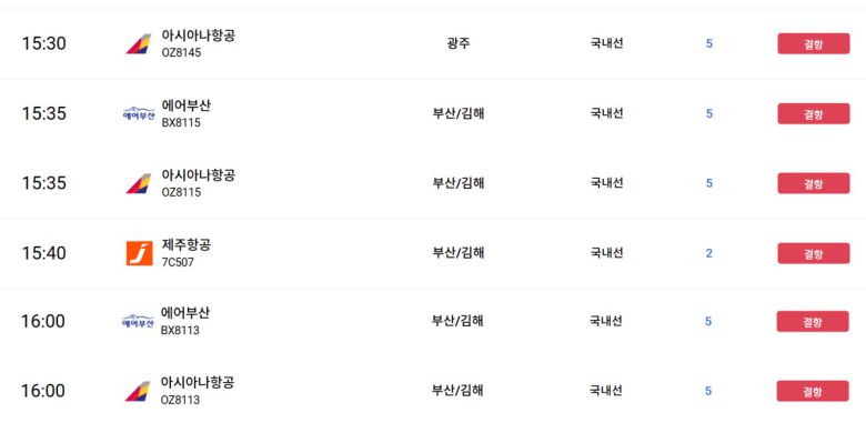 결항 항공편은 주로 청주, 광주, 김해, 원주 등 타지역 공항의 악천후 영향으로 발생했다. 현재 청주공항엔 뇌우·호우경보, 광주엔 저시정경보, 원주·사천·무안공항엔 뇌우경보가 발효돼 있다.