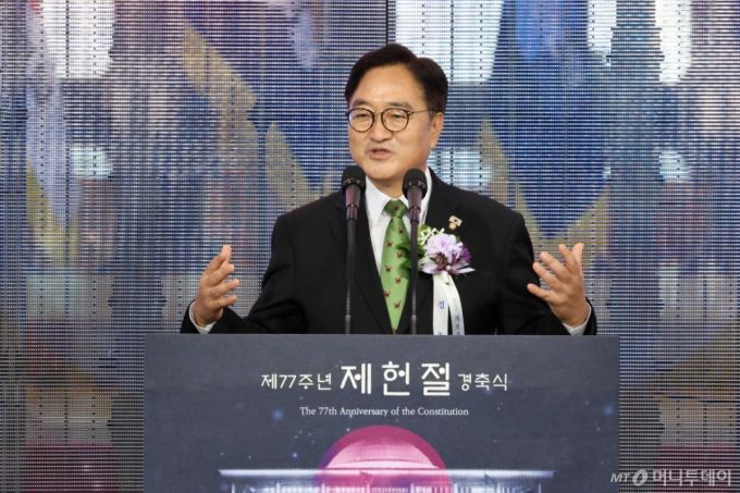 (서울=뉴스1) 국회사진기자단 = 우원식 국회의장이 17일 서울 여의도 국회에서 열린 제77주년 제헌절 경축식에서 경축사를 하고 있다. 2025.7.17/뉴스1 Copyright (C) 뉴스1. All rights reserved. 무단 전재 및 재배포, AI학습 이용 금지. /사진=(서울=뉴스1) 국회사진기자단