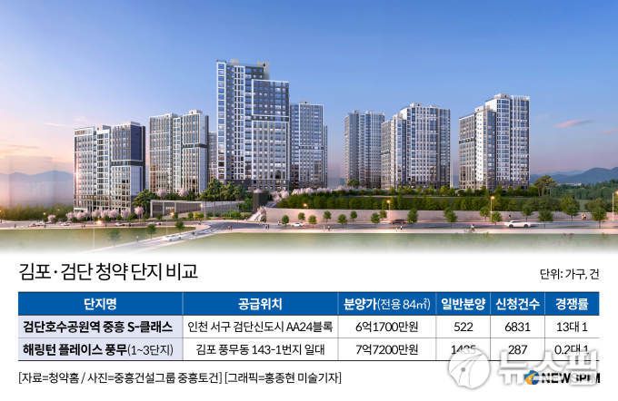 [서울=뉴스핌] 최현민 기자 = 같은날 아파트 청약에 나선 김포 '해링턴 플레이스 풍무'와 검단 '검단호수공원역 중흥 S-클래스' 두 대단지가 엇갈린 성적표를 받았다. '해링턴 플레이스 풍무'는 저조한 청약 성적으로 미달을 기록한 반면 인천 검단신도시에 공급된 '검단호수공원역 중흥 S-클래스'는 두 자릿수 경쟁률로 흥행에 성공했다.