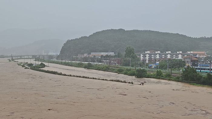 17일 오전 세종시 전동면 일대를 흐르는 하천이 쏟아진 폭우에 범람 위기다. 이날 오전 1시 12분을 기점으로 세종에는 호우경보가 발효됐다. [사진 = 연합뉴스] |