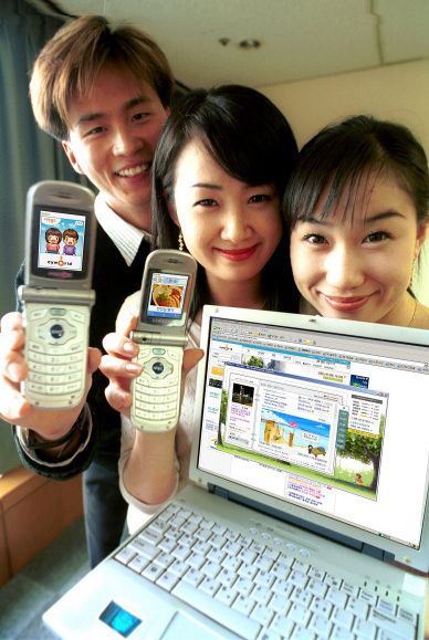 이용자들이 휴대폰과 PC로 싸이월드를 이용하는 모습. |