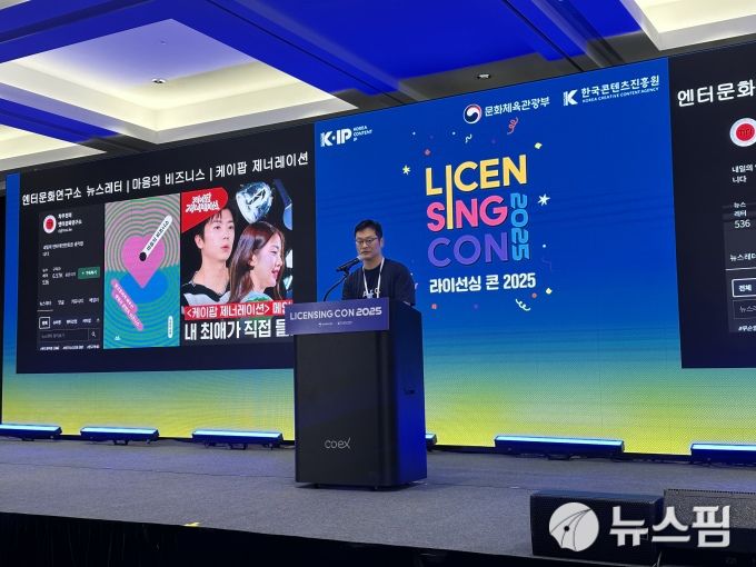 [서울=뉴스핌] 이지은 기자 = 차우진 엔터문화연구소 TMI.FM 대표가 '캐릭터 라이선싱 페어 2025'에 참석해 'K팝 IP 비즈니스'에 대해 발표하는 모습.  2025.07.17 alice09@newspim.com