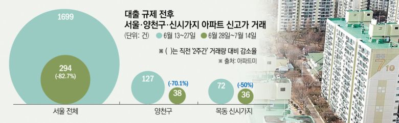 17일 부동산 플랫폼 아파트미의 서울 아파트 신고가 통계 분석 결과, 정부의 대출 규제가 시행된 6월 28일부터 7월 14일까지 서울 전체 아파트 신고가 거래는 294건으로 집계됐다. 이는 규제 발표 직전 2주간(6월 13~27일)의 1699건과 비교해 82.7% 급감한 수치다.