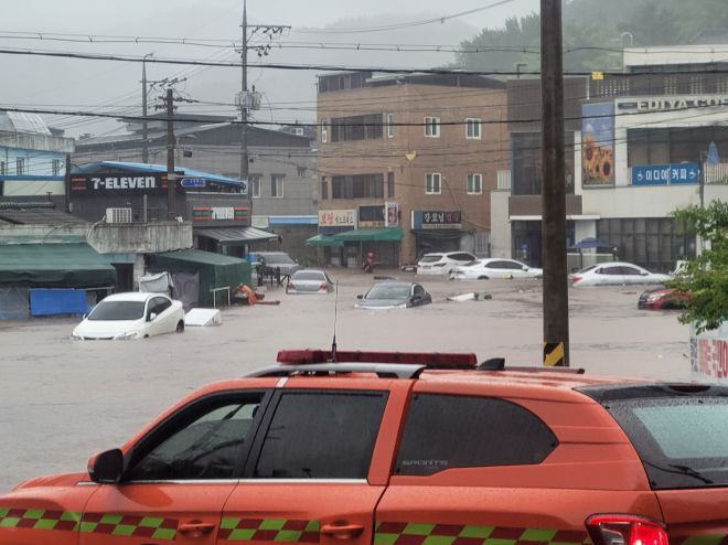 17일 대구소방안전본부 등에 따르면 이날 오후 2시 20분쯤 북구 노곡동 일대가 폭우로 침수됐다. 침수된 도로 주변에 있는 상가와 주택 절반까지 물이 차올랐으며, 인근에 주차된 차량 여러대가 침수됐다.