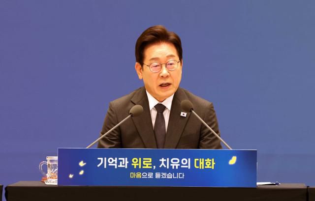 이재명 대통령이 16일 서울 종로구 청와대 영빈관에서 열린 '기억과 위로, 치유의 대화'에서 모두발언을 하고 있다. 왕태석 선임기자