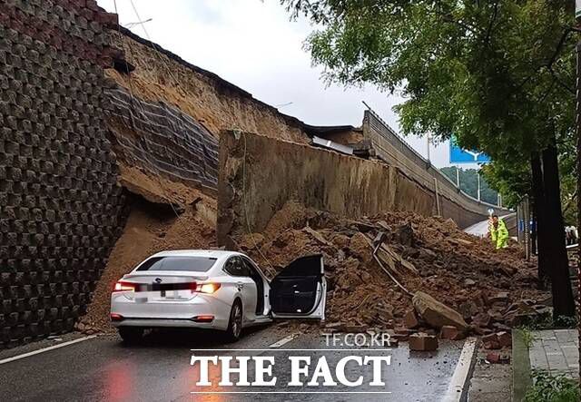 수도권 등 중부지역에 호우주의보가 발효된 지난 16일 경기 오산시 가장교차로 옹벽이 도로로 무너져 차량을 덮치는 사고가 발생해 소방 당국이 대응 1단계를 발령, 구조작업을 벌이고 있다. /뉴시스