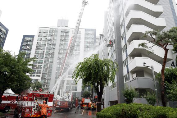 서울주택도시개발공사(SH)와 강서소방서가 지난 16일 가양 4단지 영구임대 아파트에서 사다리차, 소방 호스를 활용해 실제 재난 상황과 유사한 환경에서 진화 훈련을 하고 있다. |