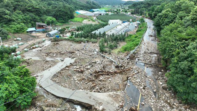 17일 충남 예산군 봉산면 봉림리 일대에 산사태로 인한 토사가 밀려내려와 있다. 김영원 기자 forever@hani.co.kr |