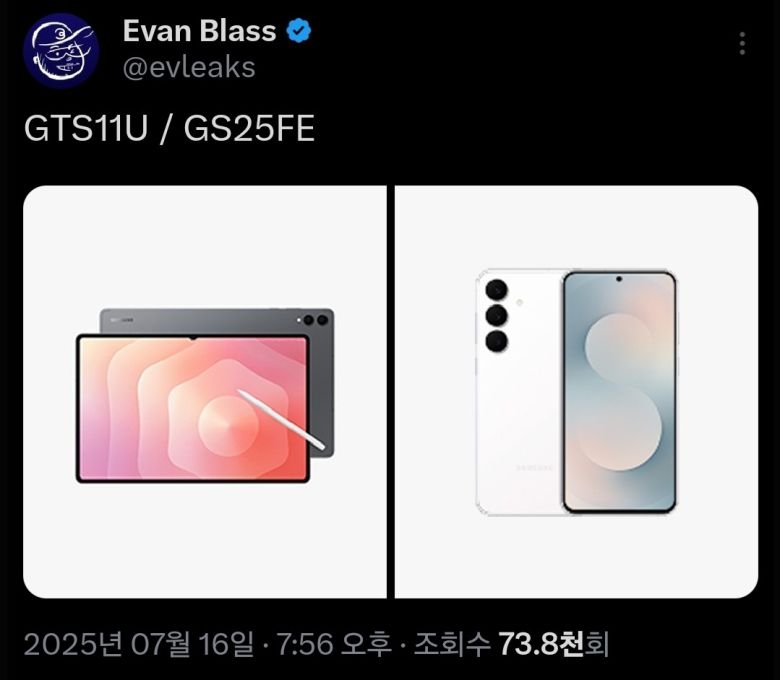 IT팁스터(유출가) 에반 블라스는 17일 자신의 엑스(X·구 트위터)를 통해 갤럭시S25 FE의 새로운 화이트 색상과 갤럭시탭S11 울트라의 렌더링 이미지를 공개했다.