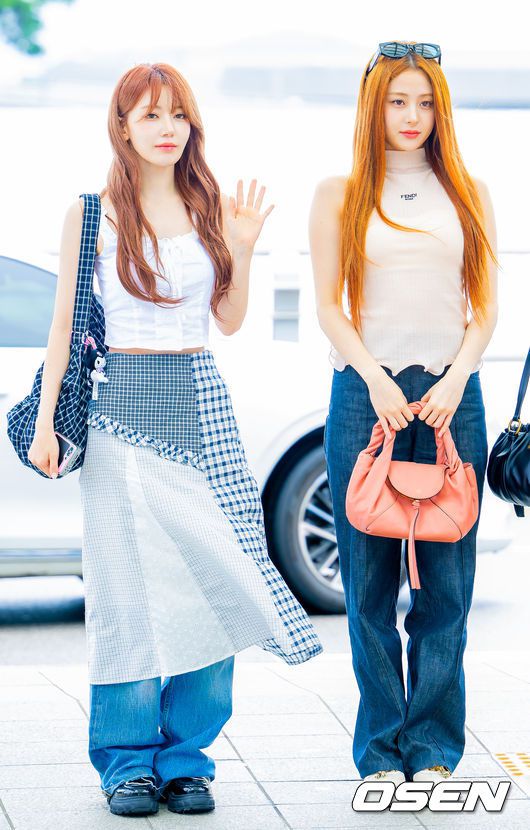 르세라핌 사쿠라와 허윤진이 출국길에 포즈를 취하고 있다. 2025.07.17 / rumi@osen.co.kr