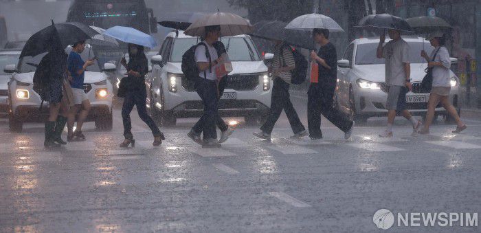 [서울=뉴스핌] 류기찬 인턴기자 = 서울에 강한 호우가 내리고 있는 17일 오후 서울 강남역 일대에서 시민들이 이동하고 있다. 2025.07.17 ryuchan0925@newspim.com